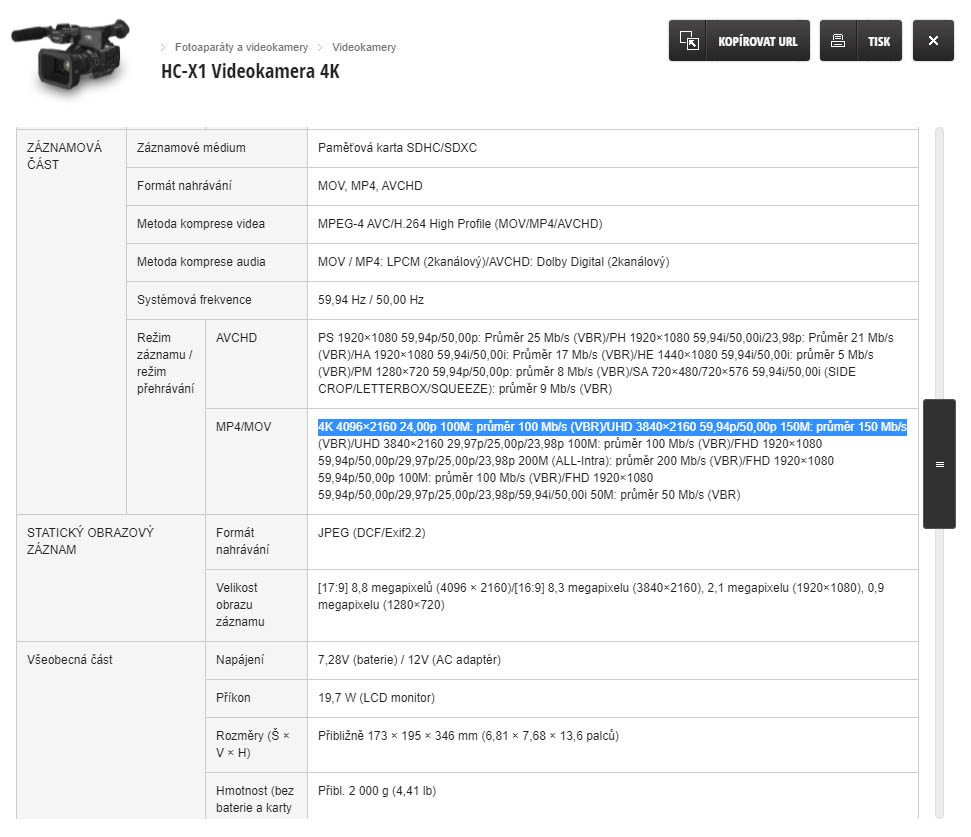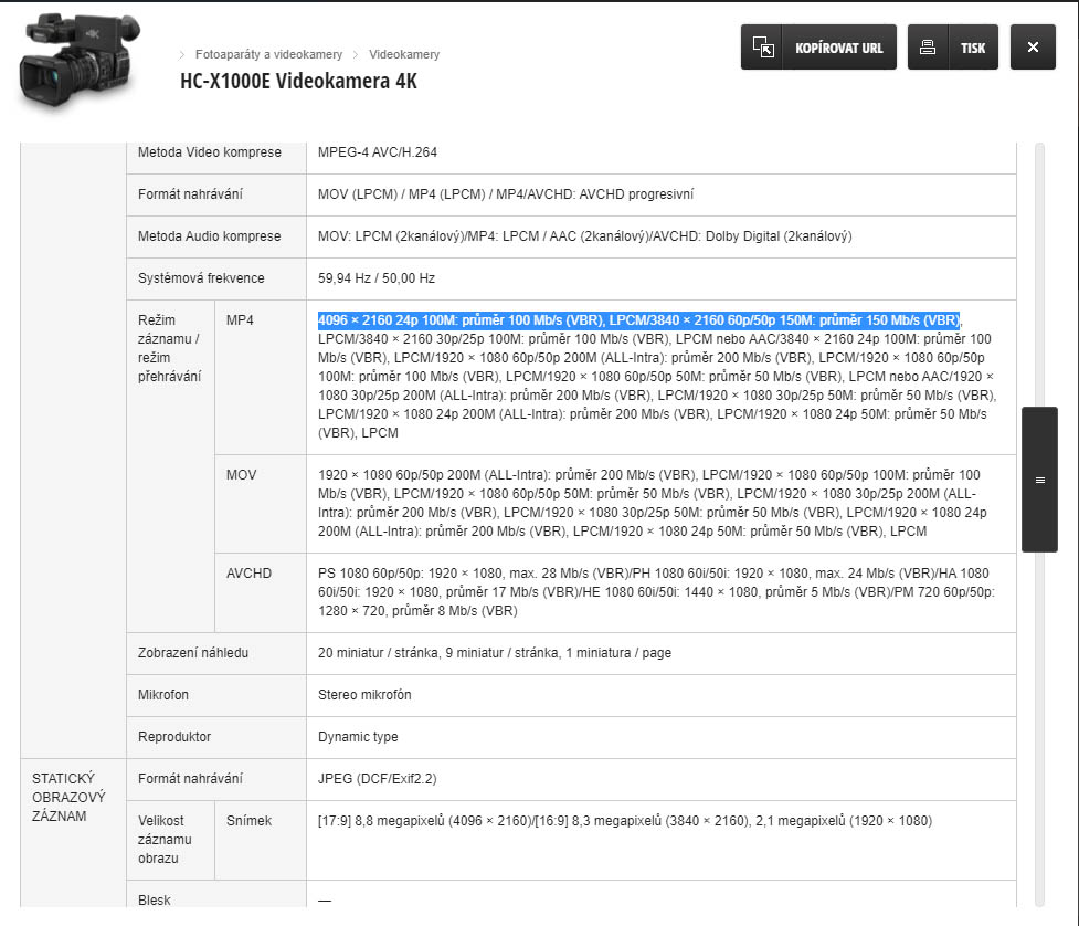 Srovnání s o dva roky později představenou „profíčkou“ HC-VX1 je jasné. Jednak je přiložen srovnávací obrázek z Webu značky, za druhé přidáme zásadní odlišnosti. Objektiv má shodný ZOOM 20x optický, ale s rozdílnými čísly ohnisek (pro přepočet na kinofilm) 29,5-600 mm u X1000 versus 25,4-508 mm u X1: což mimo jiné neznamená jenom to, že HC-X1 má o fous větší „šíro“, ale taky to, že X1000 má větší dosah detailu na maximu přiblížení. Když už jsem u těch srovnání, tak rovnou dodám, že obě kamerky (první byla HC-X1000) by měly být prvními ve své kategorii s 4K-módy při frekvenci 50 snímků (s volbou 60ti!) za vteřinu - a to při datovém toku s maximem „pouhých“ 150Mbps; a ve Full-HD je to podle údajů výrobce prý dokonce až 200Mbps…