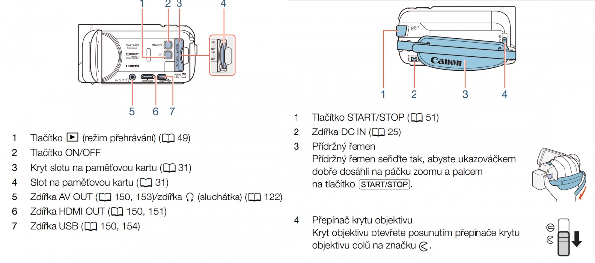 Designovou čistotu jednoduchého těla videokamery naruší HODNĚ výrazně nasazení akumulátoru. Canon opět jako loni nešetřil a dodává zákazníkovi velký kvádřík BP-727 s deklarací maximální výdrže 3:15 hodiny práce, což je pro srovnání a rozhodování mezi základy spotřebního tria VELMI dobrá pobídka. Manuálně ovládaná krytka v objektivu je výbornou fičurou (nepatentovaný výraz kolegy Neffa Nevinný), protože nikde nic neplandá a hlavně nedá se ztratit. Závit na objektivu má Ø 43 mm shodně s loňskou předchůdkyní (měla jej i Sony CX450, zde Ø 37 mm), ale zklamáním bylo nemožné dokoupení širokoúhlé předsádky WA-H43. Ověřili jsme si, že bohužel i u letošního tria HF R806/86/88 je situace shodná, ale závit lze samozřejmě použít i pro jiné optické doplňky (UV/SKY- anebo třeba šedý filtr), byť s příkladem jiného typu předsádky by to bylo asi o neakceptovatelné pořizovací ceně. Malé tělíčko se drží úplně stejně, jako konkurenční mašinky - a shodně s nimi má i titěrné stranově posuvné ovládání transfokátoru neboli zoomu, se samozřejmou proporcionalitou průběhu posuvníku: čím víc vykloním do strany, tím rychleji najíždím na detail nebo odjíždím na panorama. Je tu tlačítko video-spouště u pravého palce, spodní západka k uvolnění akumulátoru a tím jsou vyčerpány všechny čudlíky na těle prcka s nevyklopeným displejem (posuvník krytky objektivu byl tím prvním)…
