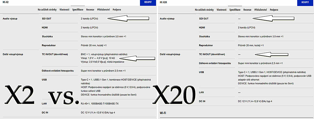 ROZDÍLY X2 A X20. Kromě již výše zmíněné absence dvou konektorů typu BNC jsou obě kamery v podstatě úplně Hlavní vymoženosti dražší verze HC-X2: SDI a TC zdířkyidentické. Související odlišnosti s chyběním obou stříbrných trubiček se zobáčky pak jsou v technických parametrech. V odstavci SEKCE DUÁLNÍHO KODEKU má vyšší Dvojka spousty údajů ke dvěma datovým tokům, což opět dokládám tabulkami z českého Webu. Oproti dosavadním rozdílům v cenách modelů S SDI+TC a BEZ těchto zdířek bych si subjektivně dovolil (pomyslně) až hvízdnout nad příplatkem téměř 40% neboli přes DVACET TISÍC korun. Respektive: jestliže u kamer s menšími čipy HC-X1500 a HC-X2000 činí rozdíl v podobném gardu asi 15% až 20% příplatku,  tak u HC-X2 už je to DARDA…