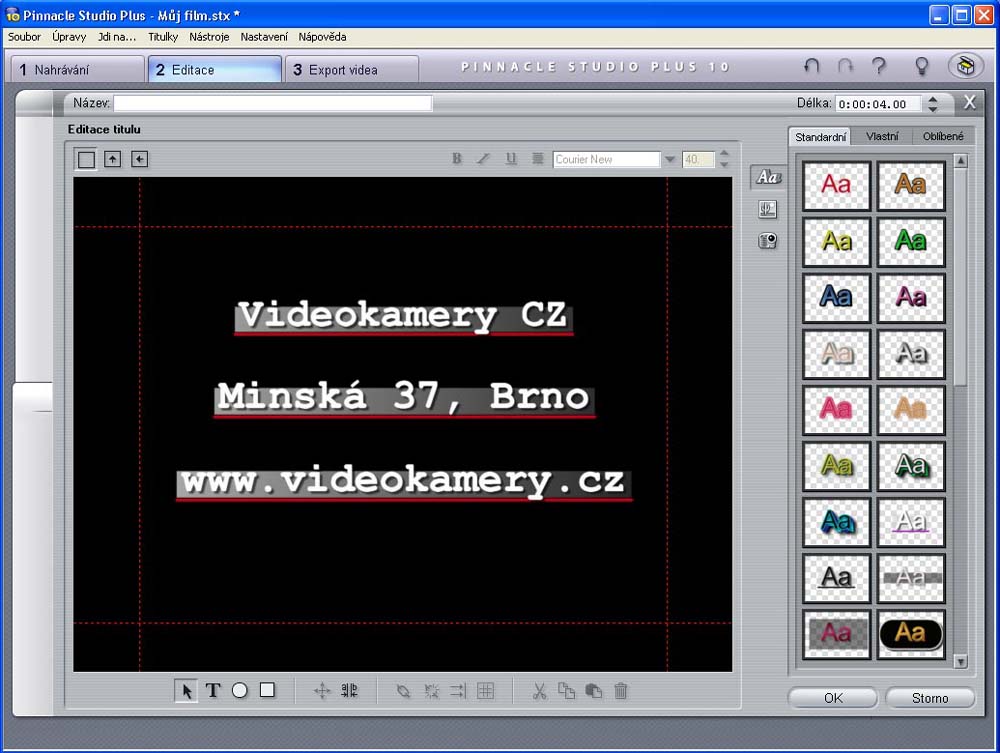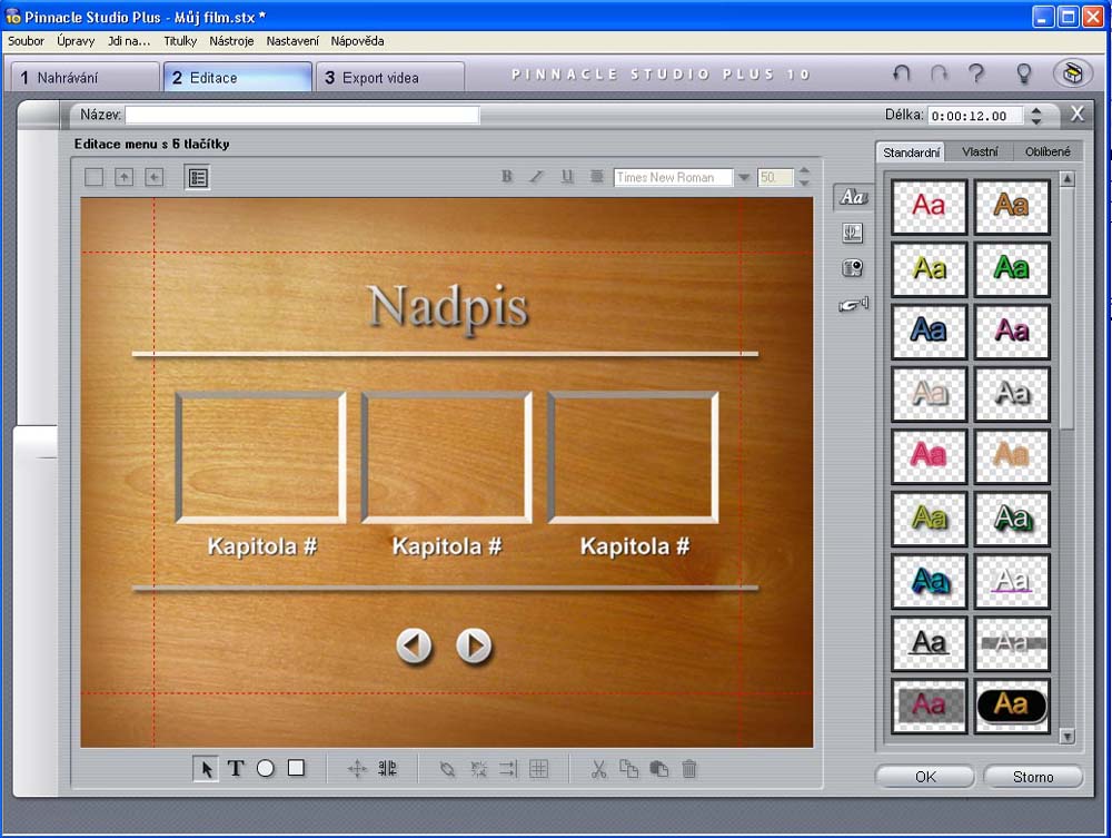 Další krokem může být vytvoření titulku. V této části jsem v podstatě nenašel žádný rozdíl od verze předešlé, což vcelku přesvědčivě dokazuje náhled na loňské titulky a srovnání s letošní obrazovkou. Tvůrce filmového dílka může nastavit běžné parametry textu (velikost, barva, rozložení atd.,…) a program zvládne i nejrůznější rolování popisků, a to vše samozřejmě funguje i s českou diakritikou. Kromě titulků je možné vkládat do záznamu tzv. DVD Menu: to znamená, že i při vložení do stolního DVD přehrávače se na začátku nerozběhne film, ale je možné si vybrat konkrétní kapitolu - s panem Jelínkem jsme takto rozdělovali například svatbu následně: úvod+cesta tam - obřad - cesta zpět+oběd - tanečky+dražba atd. Ještě evidentnější a praktičtější bude zřejmě pro cestovatele rozlišení více klipů z nikoli dlouhých dovolených pro umístění na jeden DVD-disk a podobně. Program nabízí různé typy meníček, ale je možné vytvořit i úplně vlastní DVD-nabídku…