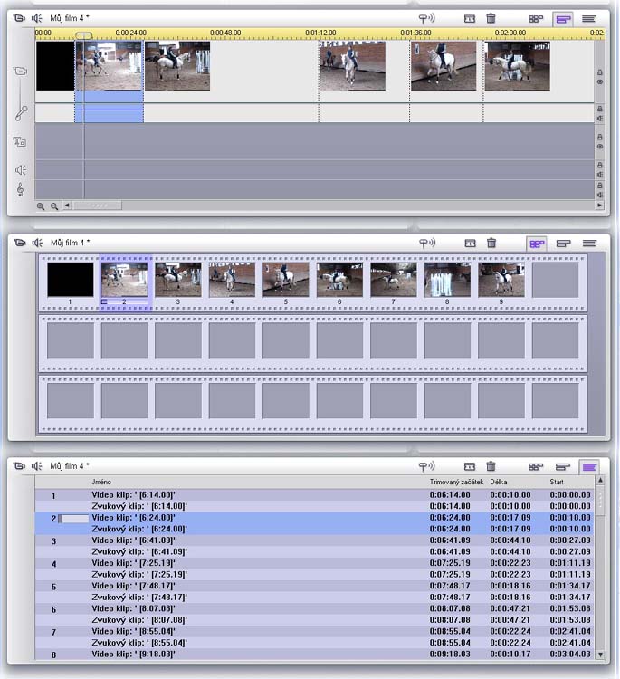 No, a když už jsme se rozhodli, v jaké kvalitě a kam se naše video má uložit a vše je již na pevném disku, můžeme se směle vrhnout do druhé části nazvané editace. Z předešlé části nám zbyla v podstatě horní část, takže zde máme náhledové okno a videoklipy uložené na HDD. Spodní půlku lze vyobrazit ve třech provedeních. Pro mě je nejschůdnější asi časová osa, ale náhled může být taky v provedení klipů nebo jako textový výpis (viz obrázek). U každého klipu je možné provádět úpravy zvl᚝, ale lze upravovat i celé skupiny. Na začátku bych doporučil selekci záběrů, které budete pro výsledné video potřebovat. Každý klip jde oříznout od začátku nebo od konce, ale není problém ani rozdělení na konkrétnější části. Díky obrazovým efektům se dají dělat s již natočeným záznamem všelijaké vylomeniny. Program nabízí jak automatické korekce obrazu (barevné podání, redukce šumu či stabilizace), tak i režimy manuální. Samozřejmostí je bezpočet obrazových efektů: starý film, sépie, černobílý záznam; a např. i zemětřesení…