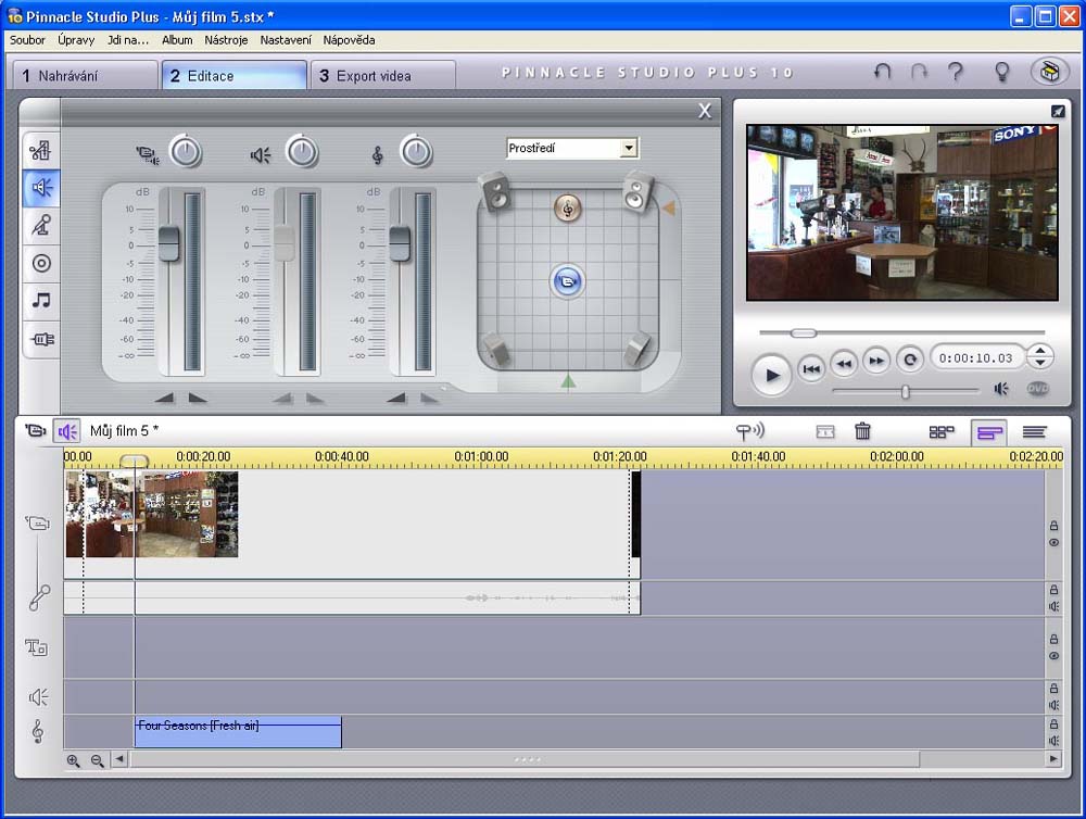 Ne všechny efekty jsou však odblokované a za některé je potřeba pustit ještě další korunku. Ze záznamu jde bez problému vytáhnout statický snímek a uložit jej jako bmp, jpg nebo tiff soubor. Dle mého názoru další vcelku zajímavá funkce je obraz v obraze včetně tzv. klíčování obrazu. Na domácí výrobu filmu ve stylu Matrix to sice ještě nevypadá, ale Létající čestmír by snad už udělat šel. Teď už jen mít doma plátno s nějakou tzv. zakázanou barvou. Jakmile máme všechny scény (klipy) upraveny dle svých představ, můžeme se směle vrhnout do další části díla a tím je zvuk. Ani zde nás nenechá Pinnacle na holičkách a bude schopen pomoci se základními úpravami. Tak například pokud nahráváme tišší scény a v nahrávce je slyšet hluk mechaniky (motorků), nabízí Pinnacle redukci šumu. Stejně tak je možné upravit hlasitost jednotlivých úseků anebo pomocí ekvalizérů upravit basy a výšky. Kromě úprav originálního zvuku z kamery jsou k dispozici dvě další audio stopy. Do jedné je možné uložit například zvuky uložené na pevném disku (potlesk, smích atd.) nebo hudební nahrávku s CD. Program pochopitelně podporuje i formát MP3 nebo WMA, bohužel asi zklamu příznivce Oggů: ty si se softwarem rozumět nebudou. Již předešlá verze nabízela možnost tvorby zvuku v tzv. 5.1 provedení a ani nová desítka není o tuto variantu ochuzena. Druhá audio-stopa je zde určena především zvuku nahranému z (externího) mikrofonního vstupu…