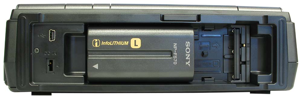 HD700: vložený AKU z pořizovací sady (Kliknutí zvětší)Vlastní práce je celkem jednoduchá, ale majitel HD700ky si nesmí zapomínat síový káblík k propojení napájecího čili nabíjecího adaptéru do závislé sítě. Když se totiž zapomene posuvný díl hlavního vypínače šoupnout do polohy OFF a bohorovně se uloží do brašny (ano 700ka se mi vejde do mé oblíbené kufříkobrašny Kipling), prostě se úplně sprostě (:-D) vybije a nahodí se jen na hlášku o nedostatku energie. Ovšem s plně nabitým akumulátorem - v balení HD700 je jakž takž kapacita NP-F570 z obrázku u tohoto odstavce - vydrží mašinka dle údajů displeje (ano, indikace o energii AKU funguje jako u kamer Sony i při vypnutém přístroji) až přes 140/240 minut provozu. A rychle dodávám, že ony dva údaje jsou tu proto, že strojek funguje samozřejmě i s vypnutým LCD a že podle mého zjištění nejsou ta čísla nijak přehnaná. A navíc - cimprlichům omluva za estetické puntičkářství - se dodávaný článek dobře vejde do svého uložení a nevyčnívá z těla, aby mohl narušovat vjem z dokonalého výtvoru. Polopatisticky řečeno: Menší pouzdro baterie z pořizovací sady je nezavazející a do terénu se svou zásobou energie k většině použití dostatečné...