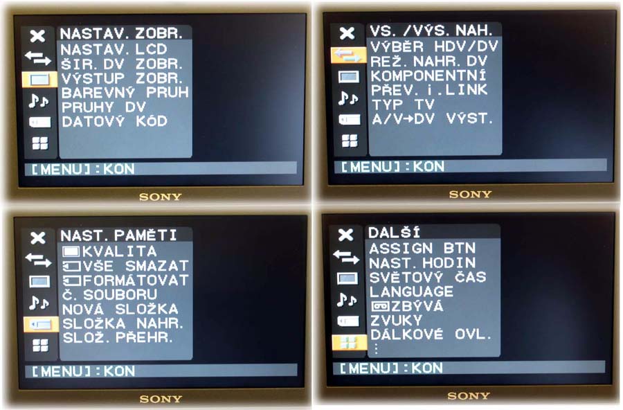 čtyři z nabídek Videowalkmanu Sony HD700 (Kliknutí zvětší)Předně musím konstatovat, že díky docela slušným možnostem narábania je seznámení se Sedmistovkou (podstatně) náročnějším procesem, než jak tomu bylo kdysi u produktových předchůdců Sony GV-S50 nebo GV-D1000. Tahle exkluzivita umí totiž přece jenom pár kousků navíc. Předně si nechá určit, co z ní poleze ven; a to jak ve smyslu poměru stran, tak i coby zvolené kvality HDV-DV, komponentního výstupu, PřEV. i. LINK (ano, jiné firmy tomu říkají Fire-Wire či IEEE1394), AV/DV-převodníku nebo např. jakési pomocné nastavovací funkce BAREVNÝ PRUH a podobně. V jiné ze sekcí NASTAV. ZVUKU má zase uživatel k dispozici volby REŽ. ZVUKU DV, MULTI ZVUK a editační DV MIX ZVUKU. A jak tak osahávám WORD CTRL+F a hledám v textu výše, ještě jsem se nezmínil o asi největší potěše (alespoň pro moji dušičku.. :-D) od Mr. Sony: VŠE se tady OVLÁDÁ TLAčÍTKY ouplně běžně! Jinými slovy: přátelé, čtenáři, profíci, fajnšmekři - tahle rozkošnost rozkošná NEMÁ DOTYKOVÝ LCD-PANEL, nýbrž "pouze" zobrazovací displej bez nutnosti jej opakovaně (nechutně) upatlávat…