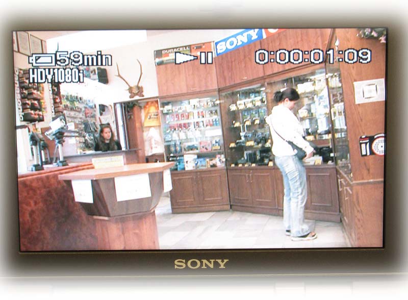 Sony HD700: nabídka zvukových nastavení (Kliknutí zvětší)HD700: obraz po propojení s videokamerou (Kliknutí zvětší)K postřehům vyjmenuji i nastavení a indikace, které se dají spatřit a vyfotit, ale nikoli asi uvidět v nějakém letáku nebo na stránkách producenta. Tak například volby nastavení zvuku obsahují nejen běžné dělení na 12/16bit-mód (nefunguje v HDV), ale například i tzv. MULTI ZVUK (Stereo/1/2) anebo DV MIX (ST1-MIX-ST2). K nastavení LCD-panelu dodám, že lze řídit v nabídce jeho (velkými písmeny cituji displej) JAS, KONTRAST, ÚROVEň BAREV, FÁZE BAREV, OSTROST a PROFIL LCD (tady je dokonce plná pětice možností NAčÍST, ULOŽIT, NÁZ. PROFILU, ODSTRANIT a OD NULY). Z jiného soudku sdělme čtenáři cosi o startu stroje (klidně i pouze 3 vteřiny), vestavěných reproduktorcích (na svou velikost až s překvapivě slušnými výsledky i hlasitostí) anebo někdejší video-klasice Sony, tedy co se týká nemožnosti omylu vymazat úsek na pásce jen jedním tlačítkem REC: jsou tu dvě s nutností je použít současně. Dodám, že logickou vymožeností je i jakýsi monitoring při natáčení: coby zvýraznění přehledu o snímaných scénách díky (tedy plošně) téměř osmkrát většímu displeji HD700 - samozřejmě po propojení s videokamerou (snímek vpravo); a s tím souvislou další logikou (možného) šetření mechaniky kamery nahráváním do HD700…