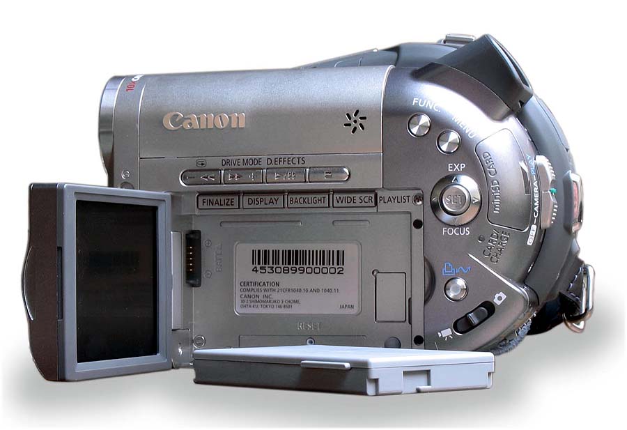 Nižší DC10 je vybavena snímacím CCD-čipem úhlopříčky 1/4" a 1,330.000 obrazovými body (efektivních Px je pak 1,233.000 pro foto a 860.000 pro video), zatímco vybavenější DC20 má CCD-čip 1/3,9" s 2.200.000 body (efektivních 2.000.000 pro foto a 1.770.000 pro video). Obě kamery jsou vybaveny objektivy Canon s desetinásobným optickým přiblížením a světelností f/1,8. Ohnisková vzdálenost je pro DC10 46,7-467 mm a pro DC20 o facku širokoúhlejších 40,6-406 mm (tyto hodnoty jsou přepočteny na ekvivalent kinofilmu). Barevný hledáček (113.000 bodů) a 2,5" výklopný displej (123.000 bodů) je u obou výrobků stejný. Hledáček je zde bohužel nevýsuvný a nevýklopný - jak je v současné době módní - naštěstí je výrazně natočen směrem nahoru, což natáčení usnadní. Statické snímky se ukládají na paměovou kartu typu mini-SD, což je zatím nepříliš rozšířený formát, známý spíše majitelům některých mobilů. Zcela nový typ AKU je umístěn pod výklopným displejem - což prakticky znemožňuje použití větší kapacity - a je označen BP-208. Krytka objektivu je vestavěná - otevření a zavření se provádí mechanickou páčkou - a konektory jsou standardní. K informacím přikládáme několik vyobrazení (klikněte na odkazy)…
