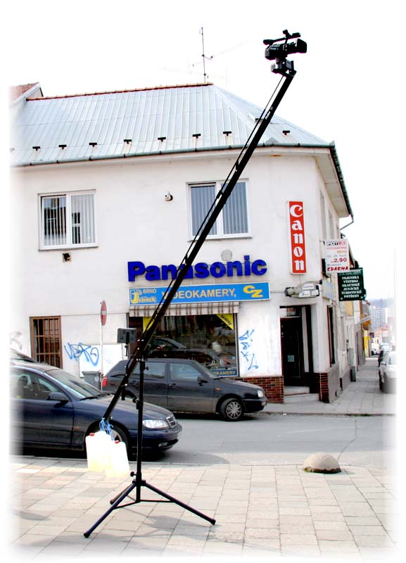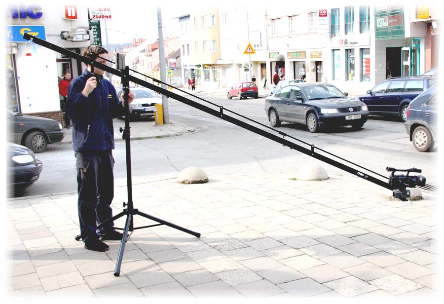 Kamerové jeřáby. Existují sice spousty kutilských výtvorů více či méně profesionálního provedení nebo zpracování, ale opravdovým profíkům nebo společnostem s finanční rezervou jsou nabízeny jeřáby (například) z firmy Erpea. A model Pro-AM250 jsme měli k dispozici na testík i v naší prodejně. Praktické zkoušení na rušné tramvajové ulici (Štráse pro šaliny a šmirgly, jak si tu hantecujeme, spoluobčané z čech :-D) měla sice za efekt VELMI pomalé projíždění aut kolem soustrojí, ale jinak zdařilé poznávání. Dodavatel nám dokonce občas umí dodat kousek a my jej drze prodáme koncovému uživateli - a víme, že velmi praktický displej lze nahradit univerzální záležitostí za zlomek ceny. Nuže: jeřáby existují, ale pokud nechce jít navnaděný fanoušek cestou VELKÉHO podílu zámečničiny, musí si nachystat pověstný ranec a nelitovat platidla. Poutavý výsledek jaksi plovoucí videokamery vzduchem v 3D-provedení se ale nakonec postará o dobrý pocit z vynaložených prostředků, nota bene třebas při vykloněné mašince na hlavě jeřábu z balkonu vyšší budovy. Poznámka - pro natáčení rodinných dovolených na Jadranu se doplněk amatérům nedoporučuje, neskladnost jistá…