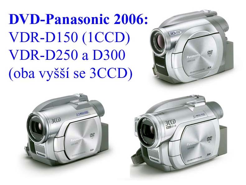 Panasonic vsadil už loni na převahu přístrojů s emblémem 3CCD: a letos budou mít videokamery s jedním snímačem v jeho sortimentu ještě méně místa. A stejně jako u Sony nás český WEB může dobře navigovat už pár týdnů nazpět. Vidíme zde, že loňská přestávka formátu DVD-RAM u slavné značky - po někdejší prvotině VDR-M30 a poté i předloňském duu VDR-M50/70 - nebyla ukončením výroby tzv. systému oboustranného vypalování, ale (nejspíše) jen čekací pauzou. Letos totiž vyrukuje Panasonic hned s trojicí mašinek, z nichž dokonce hned dvě vybavuje třemi CCD. Jednočip se má nazývat VDR-D150 a vyšší typy pak D250 a D300. Svými rozměry jsou jak základní 150tka masivnější proti druhdy recenzované dvojici Canon DC10/20 (ale zase menší oproti Sony DVD405 apod.), tak vyšší typy 250/300 podobně větší proti avizované DC40. Rozhodující výhodou zmiňovaných videokamer je možnost oboustranného záznamu (disk se musí otočit), i když kompatibilita DVD-RAM je diskutabilní: oni se ti výrobci ne a ne domluvit pro dobro spotřebitele. Ke komprimačnímu odstavci zopakujme zmínku o podzimním překvapení SD-kamery SDR-S100, již jsme představili co možná nejpoctivěji i my…