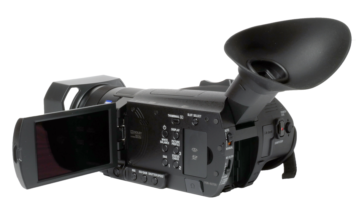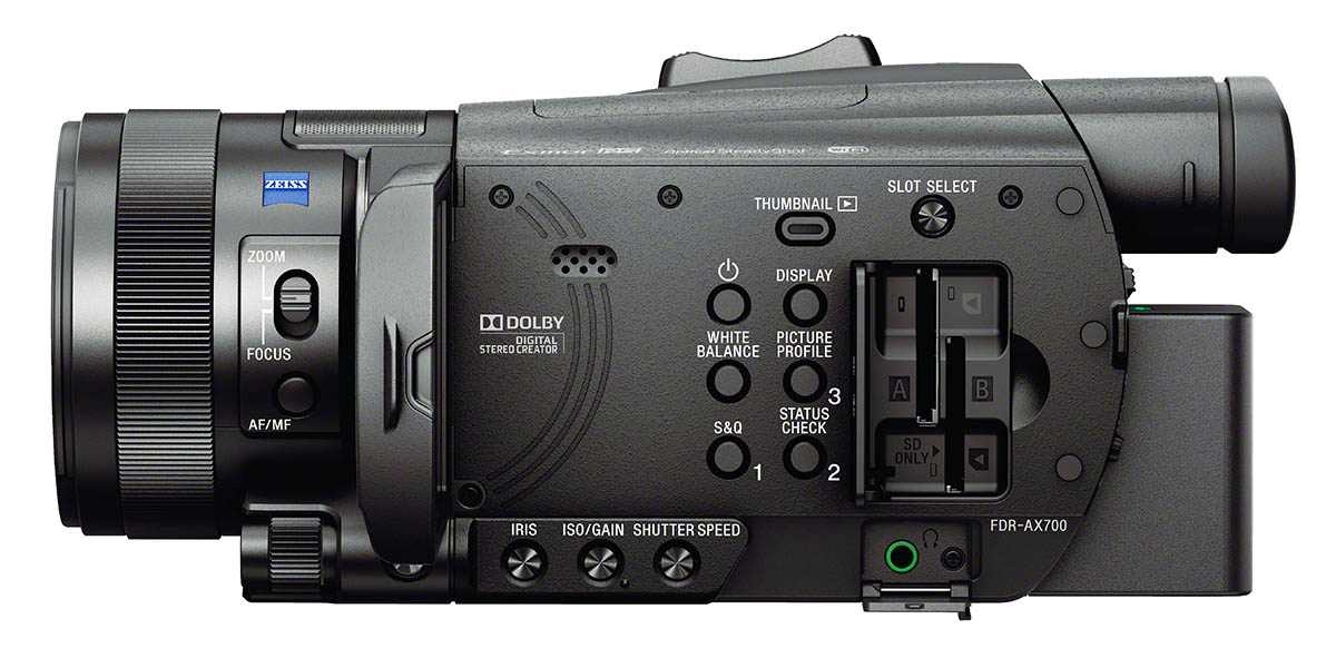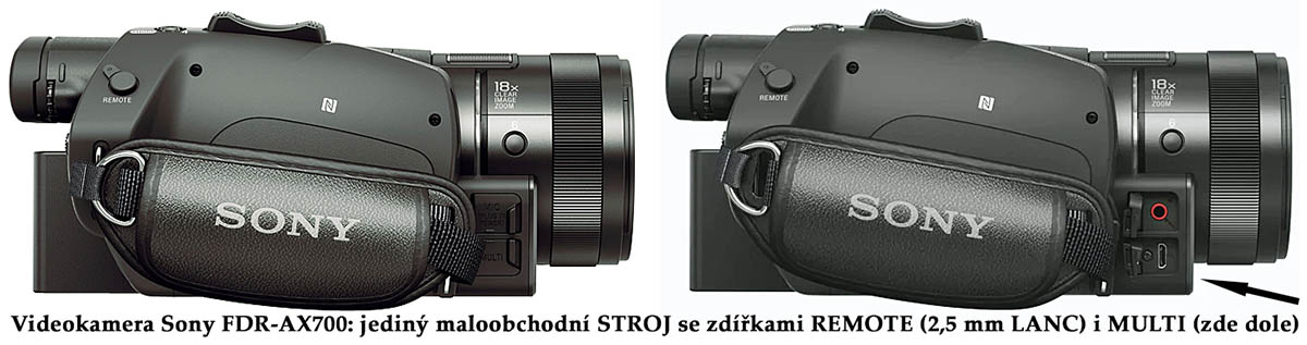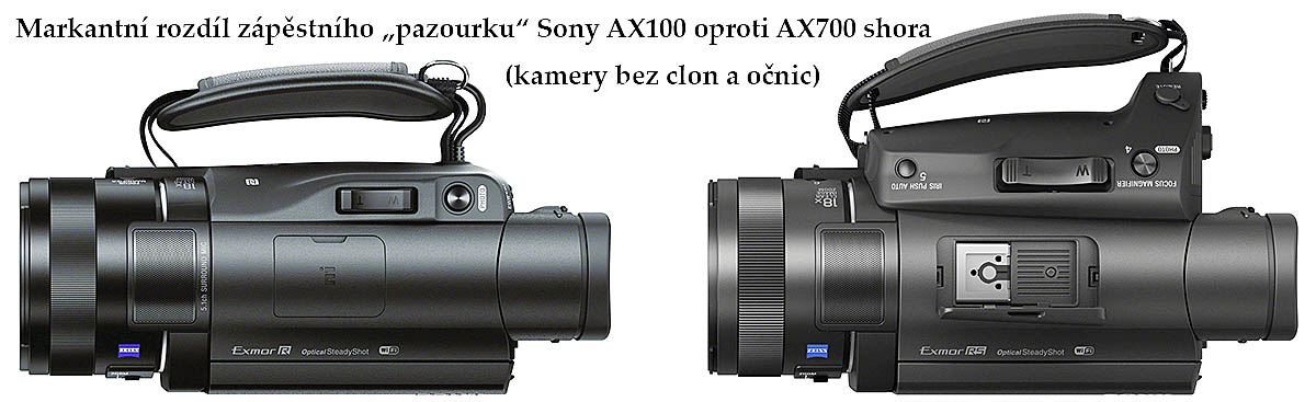 VIDEOKAMERY Sony FDR-AX700 a FDR-AX100 jsou modely poloprofesionálního určení pro náročnější Videokamera Sony FDR-AX700 v zadní perspektivě zlevafajnšmekry a všechny stupně živnostenských kameramanů nebo firem, které mají ambice odevzdávat za smluvený honorář SOLIDNÍ PRÁCI. Sluší se sem přidat ANEBO pro nejnáročnější fanoušky videa, kteří nemají hluboko do kapsy a vědí, nač jim bude ta či ona „fičura“ OBROVSKÉ výbavy a skvělého osazení. Obě krásné mašiny se liší jednoznačně už zvenčí v detailech à la velká očnice hledáčku; a hlavně zřetelně masivnějším dílem úchopu pro pravičku. Ten nazývám - už mnoho let - „pazourkem“: to hlavně kvůli dobře pasujícím tvarům ke dlani neboli spolehlivému uchopení ovládající rukou uživatele-kameramana…