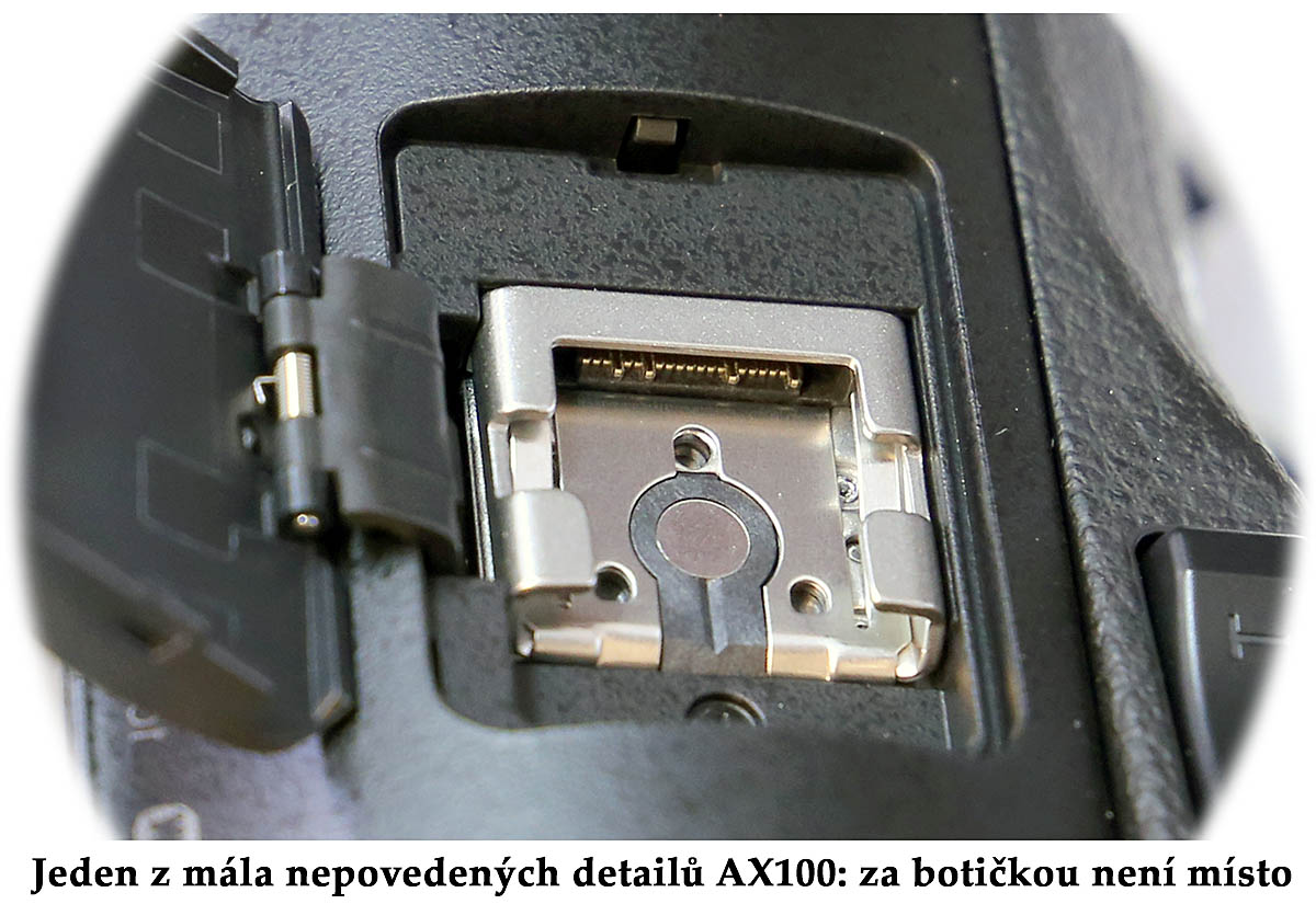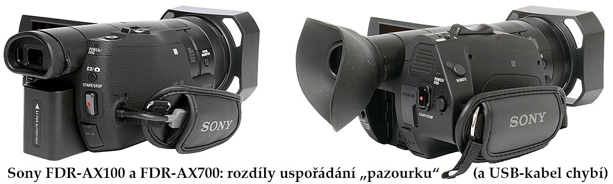KATEGORIE a HMOTA obou krásných strojů. OBŘÍ ROZDÍL ERGONOMIE na pravoboku je velmi názorně viditelný Sony FDR-AX700 má klasickou LANC-zdířku k ovládánína snímcích mašinek shora. Výše zmiňovaný PAZOUREK či úchyt pravičky činí SEDMISTOVKU proti STOVCE výrazně širší a kameramanova pravice zde má podstatně jiné pohodlí i viditelně větší (delší) třebas kolíbku transfokátoru. Čtenáři si všimnou ještě jednoho detailu, který vůbec není zanedbatelný: Inteligentní botička u dražšího strojku je vsazena do delšího „lůžka“, což jí dává mnohem univerzálnějšího využití. Do botičky AX100, která za sebou nemá místo k nasunutí standardních ližin, se například i madlo na horní nošení musí připevňovat pomocí redukcí do botky, což je jakési "dvojité harakiri"…