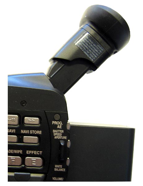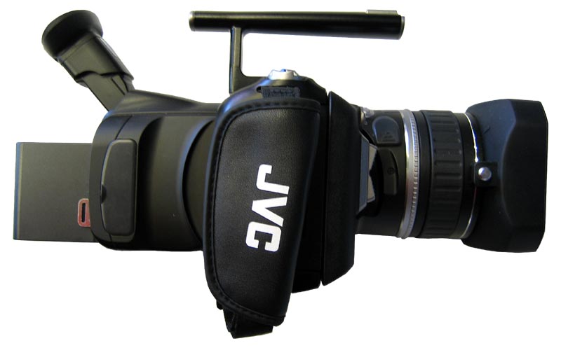 Zatímco amatérské mini-videokamery (nejen) u firmy JVC mají obvykle přibalen akumulátor s kapacitou 800mAh, tady je hned typ BN-V428U, tedy s plnými 2.800mAh! A že se pak kamera s oním AKU taktak vejde do brašny, kterou mám oblíbenou pro XM2 (Hama 26059)? No - holt už to není opravdu žádný střízlík. Elegantní rukoje s botičkou pro příslušenství najde nabyvatel v krabici zvl᚝ a pomocí šroubu se stativovým závitem ji našroubuje na tělo. A že se jim tam v Japonsku už nechtělo dělat tzv. inteligentní kontakty? No - aspoň že na stroji nechybí např. mikrofonní zdířka (a sluchátková pod zadní krytkou také neabsentuje). Do pravého úhlu vpřed otočný kloub držícího madla se zápěstním řemínkem - respektive jeho funkci - jsem dokonaleji pochopil až po přečtení formulace z českého katalogu: snadno přecházet z vysokého do nízkého úhlu snímání. A výsuvný a výklopný (a barevný) hledáček s velkým a celkem pohodlným gumovým okulárem vítám velmi. Poněkud těžko přestavitelné polohy hlavního vypínače/přepínače funkcí mohou být problémem našeho kusu a nakonec mám dojem, že se mi to zdálo za těch několik hodin hraní s kamerou skoro i docela praktické: alespoň palec kameramana nepřejede někam jinam…