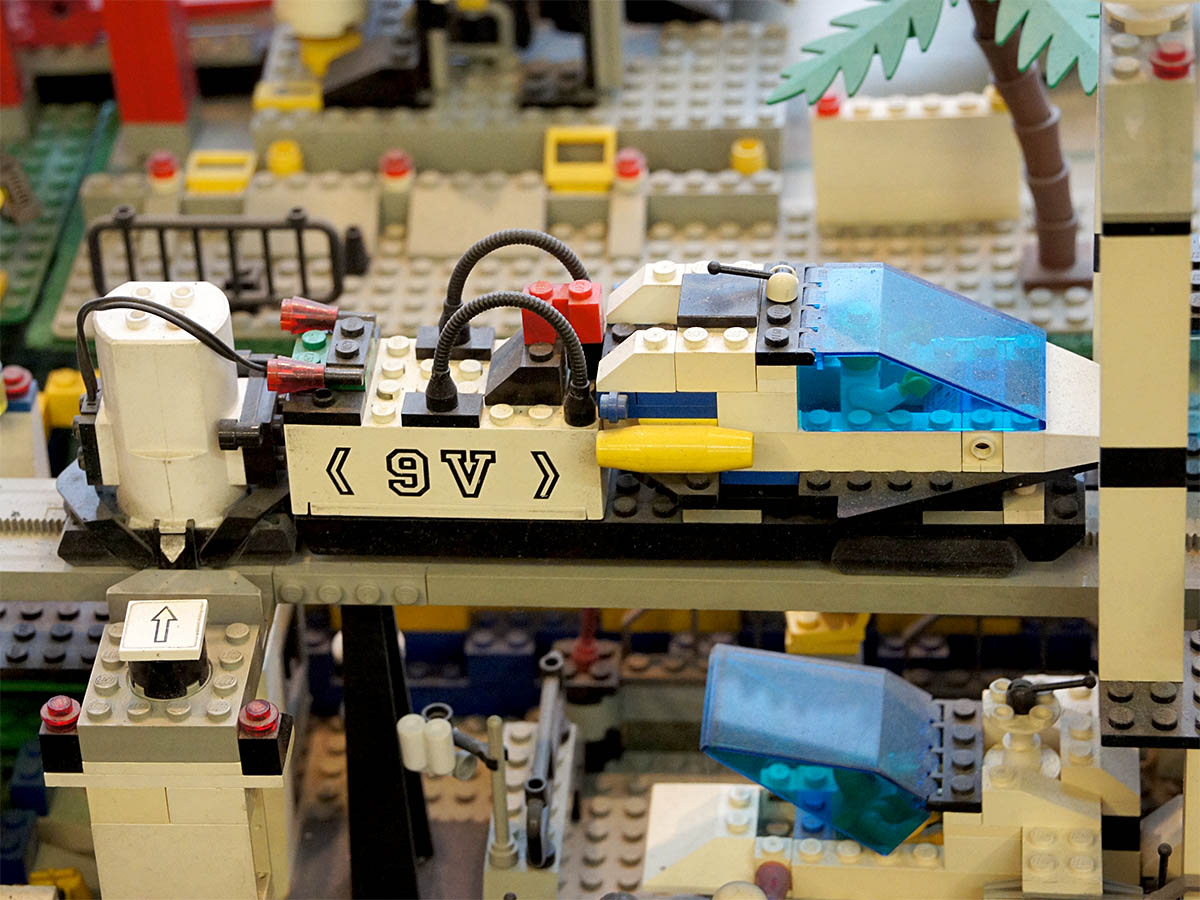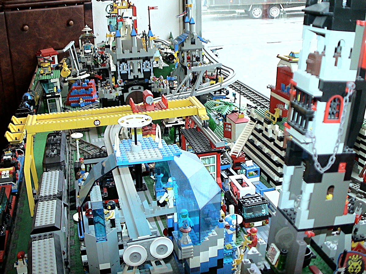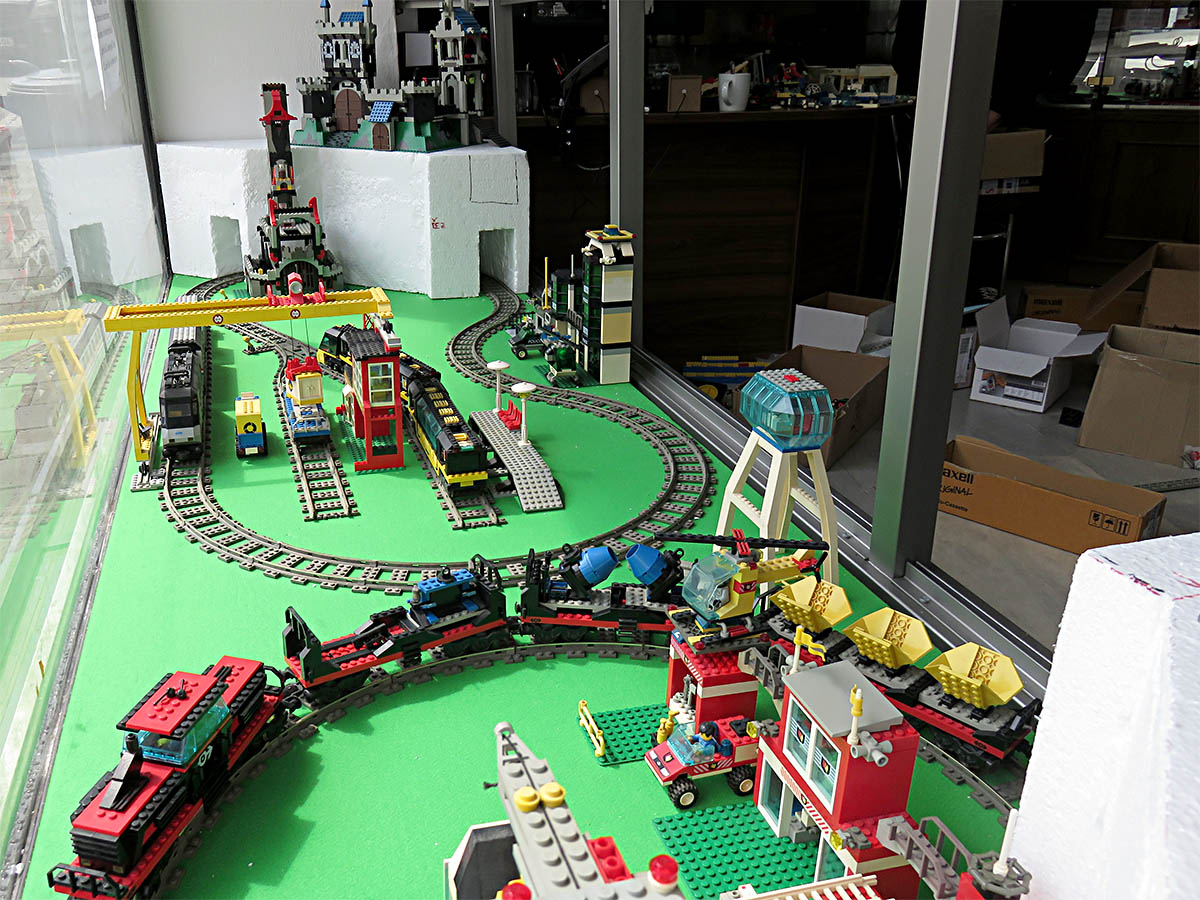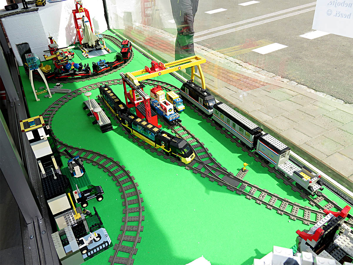 Kamery tedy snímaly kolejiště a propojením kabeláží do zavěšených monitorů na dalším výrobku zámečnického řemesla se mohl každý návštěvník pokochat obrazem a vyzkoušet si funkce jednotlivých přístrojů. Na přelomu let 1996/97 jsme zavedli nejen počítače coby skladové hospodářství, ale hlavně jsme otevřeli druhou prodejnu na Lidické ulici a rozšířili atrakce o stavebnice Lego (Lidická 14 ->) nebo zcela předělali modelový svět TT na stejný Lego-systém za výlohou na Minské 37. Stáří či spíše vyspělost a odolnost stavebnic, které právě čistíme a sestavujeme do pestré varianty při přestavbě, je asi dostatečným důkazem o kvalitě stavebnicové značky Lego, byť nikoli za lidové ceny. Mimochodem: prodejnu v Lidické ulici (viz mini-foto v textu) jsme opouštěli po 4 letech se zármutkem na konci roku 2000…