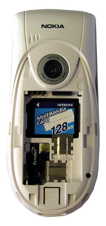 První drobná výtka výrobci musí okamžitě následovat: telefon má slot pouze pro MMC (MULTI-MEDIA-CARD)! Sice do něj mírným násilím vtlačíte i SD-kartu - má dva kontakty navíc a je o půl milimetru silnější - ale přístroj ji vůbec „nevidí“! Na vysvětlenou: výrobci kamer a D-fotoaparátů produkují sloty s universálním přijímáním jak SD-karet (SECURE-DIGITAL), tak i zde zmiňovaných MMC-karet. SD-karta nahradila předloni MMC a její perspektiva je nesrovnatelná (2GB-nosič jsem už viděl na vlastní oči!), její rychlost je větší a přitom je tak málo rozdílná… A jak známo, MMC dnes není ani nijak jednoduché sehnat (naštěstí se tím také živíme), ani neexistuje větší kapacita, než jsem uvedl v předchozím odstavci. No dobře: dejme tomu, že zatím lze (ale vcelku zřídka) sehnat MMC různých kapacit - ozvěte se, vypomůžeme - a nechejme to jako „pouhý pocit“…