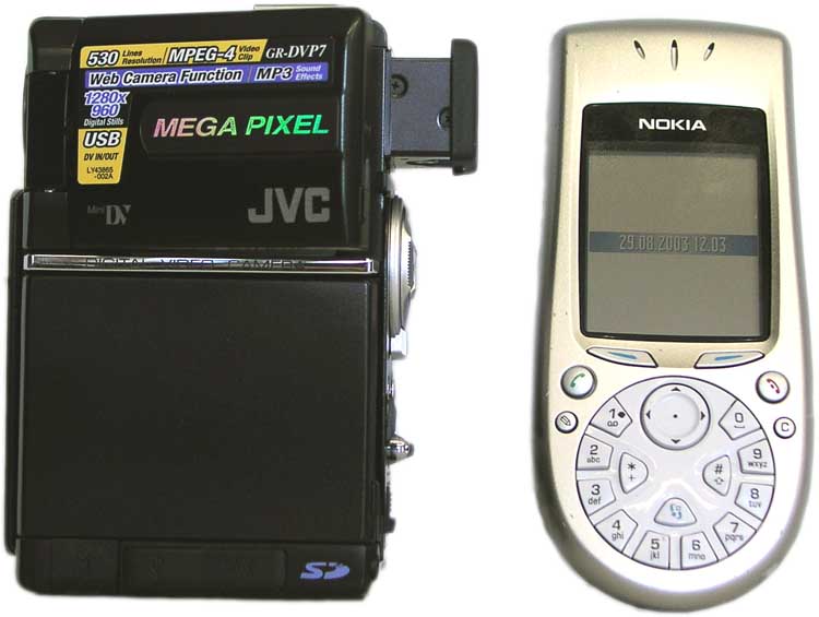 Srovnání s nejmenší videokamerou systému mini-DV: zde je JVC GR-DVP7 vedle mobilu Nokia 3650 (Klikni pro zvětšení)