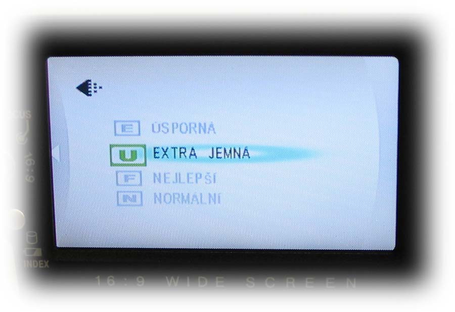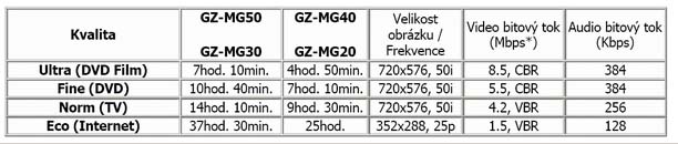 datových toků v závislosti na čase nahrávky bude platit i pro popisovanou verzi diskovky. V módu ECO (v čs. nabídce ÚSPORNÁ) se tedy jako v jediném nastavení změní i poměr stran videa na poněkud méně koukatelných (na větší televizi určitě) 352x288 bodů, přičemž oproti nejvyššímu toku 8,5Mbps se sníží hukot dat až na 1,5Mbps. Toky zvukových bytů i závislosti na zvolených módech a čase nahrávky jsou z tabulky patrny (platí údaje pro MG50). Jo, to jsem sice zjistil, ale následně byl docela překvapen, že i ona ÚSPORNÁ kvalita E vyhlíží nakonec mezi ukázkami (viz naše Galerie) dost pohodově…
