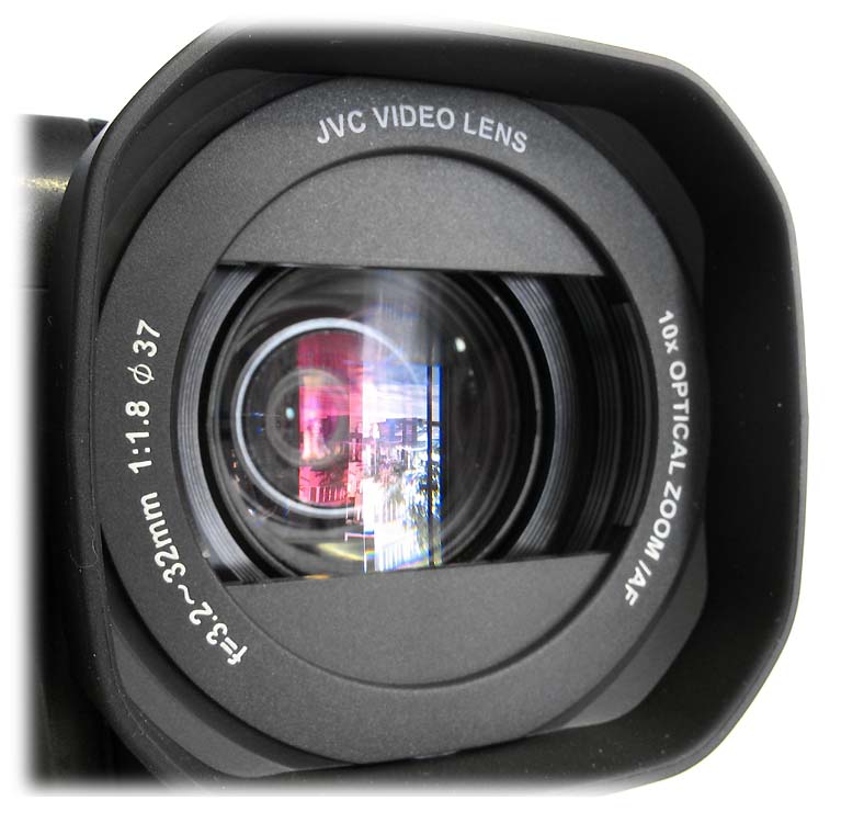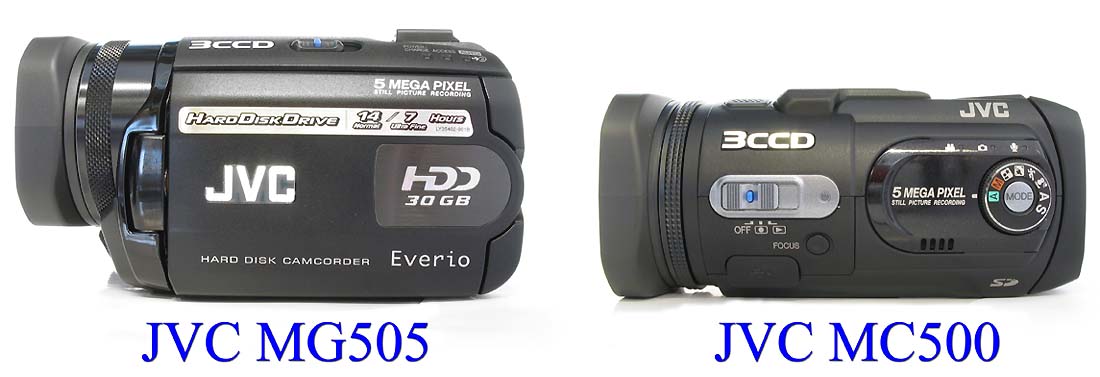 Videokamera JVC MG505 je černočerná a (předpokládám) s úplně shodným objektivem jako dosud jediná tříčipovka amatérské éry producenta. 10násobný optický ZOOM je doplněn 300násobkem digitálního zvětšení, ve foto-režimu je pak ZOOM jen 8násobný. Objektiv s efektní sluneční clonou nese logo JVC a nechá si přišroubovat doplňky se závitem 37 mm, přepočet na kinofilm Victor jako obvykle neudává, rozsah vidíme f=3,2-32 mm. Maximální rozlišení fotek je udáváno výrobcem 2.560 x 1.920 bodů a pokud jde o video, jsou k dispozici obvyklé módy od toho nejkvalitnějšího se (zhruba) 7 1/4 hodinovou kapacitou HDD až po nejvíce stlačený; a s ohromujícím číslem až 37,5 hodiny videa. Předpokládám, že loni nabídnutá tabulka