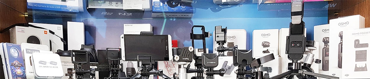 Detail naší vitrínky: poličky s DJI OSMO Pocket a doplňky