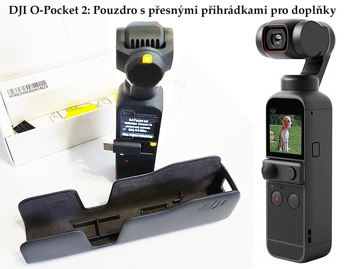 Pouzdro s výdutí pro konektor, vlastně 2-3. Kapsička DVĚ jde do obalu HODNĚ natěsno, ale po získání „Grifu“ jde DJI OSMO Pockte 2: pouzdro má přihrádky pro doplňkymašinku vytáhnout ven celkem rozumně. Jenom se nesmí uživatel jaksi zamyslet a tahat prcka ven za citlivou kulisu s joystickem. Každopádně je v celé vývojové a výrobní genialitě firmy DJI nějaký drobný exces rozhodně tolerovatelný. A těsnost pouzdra se určitě nebude zdát praktická mnoha uživatelům. Pomoc mohl něajký řemínek, klip nebo zaklapávací prverk, ale uznávám, že takhle se aspoň nemůže nic "podělat". Vývoj bezpečnosti uložení sdělím v recenzi, protože si budu pár týdnů se "svým" Robíkem hrát… Mrkající